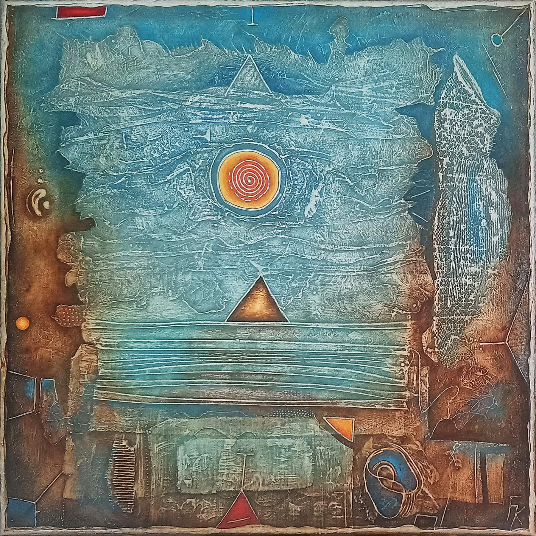Fero Kučo – Mýtická krajina, olej a špeciálna technika, 95 x 95 cm