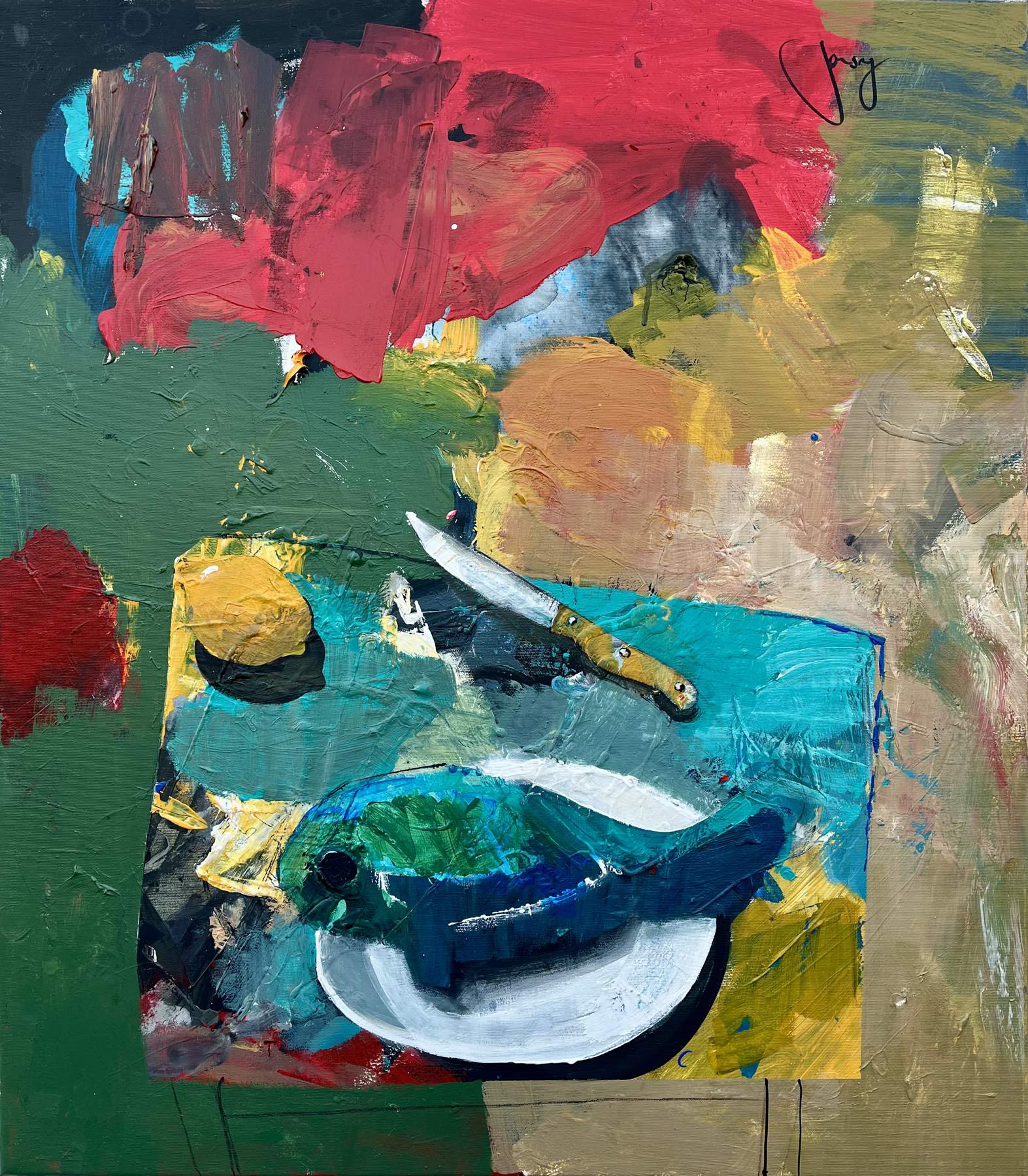 Jonsy Gáll – Ryba, citrón a nôž, akryl na plátne, 80 x 70 cm