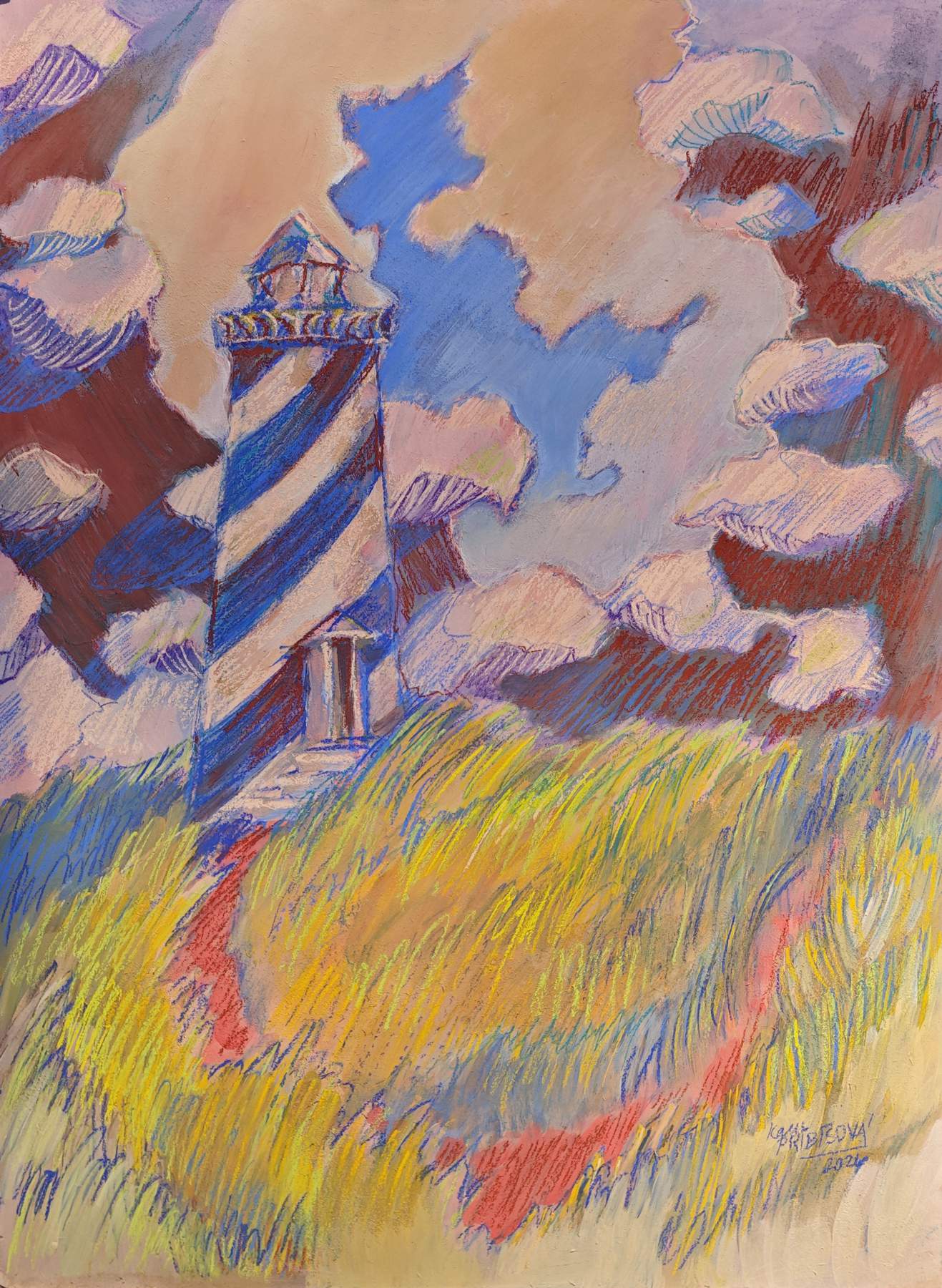 Kam Pribišová – Maják v poli, kombinovaná technika /akryl, pastel/ na kartóne, 70 x 51 cm, 2026
