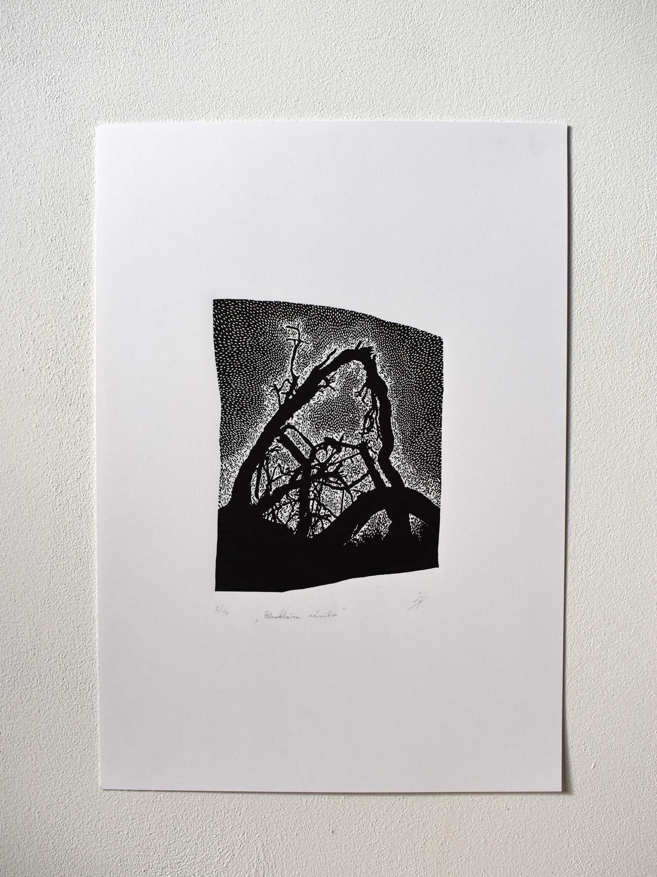 Katarína Šáleková – Štruktúra zániku, linoryt, rozmer matrice 21,6 x 17 cm, rozmer papiera 50 x 35 cm, 2024