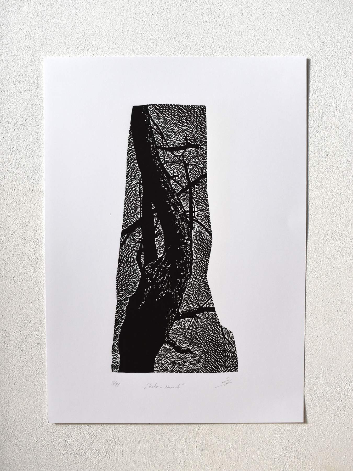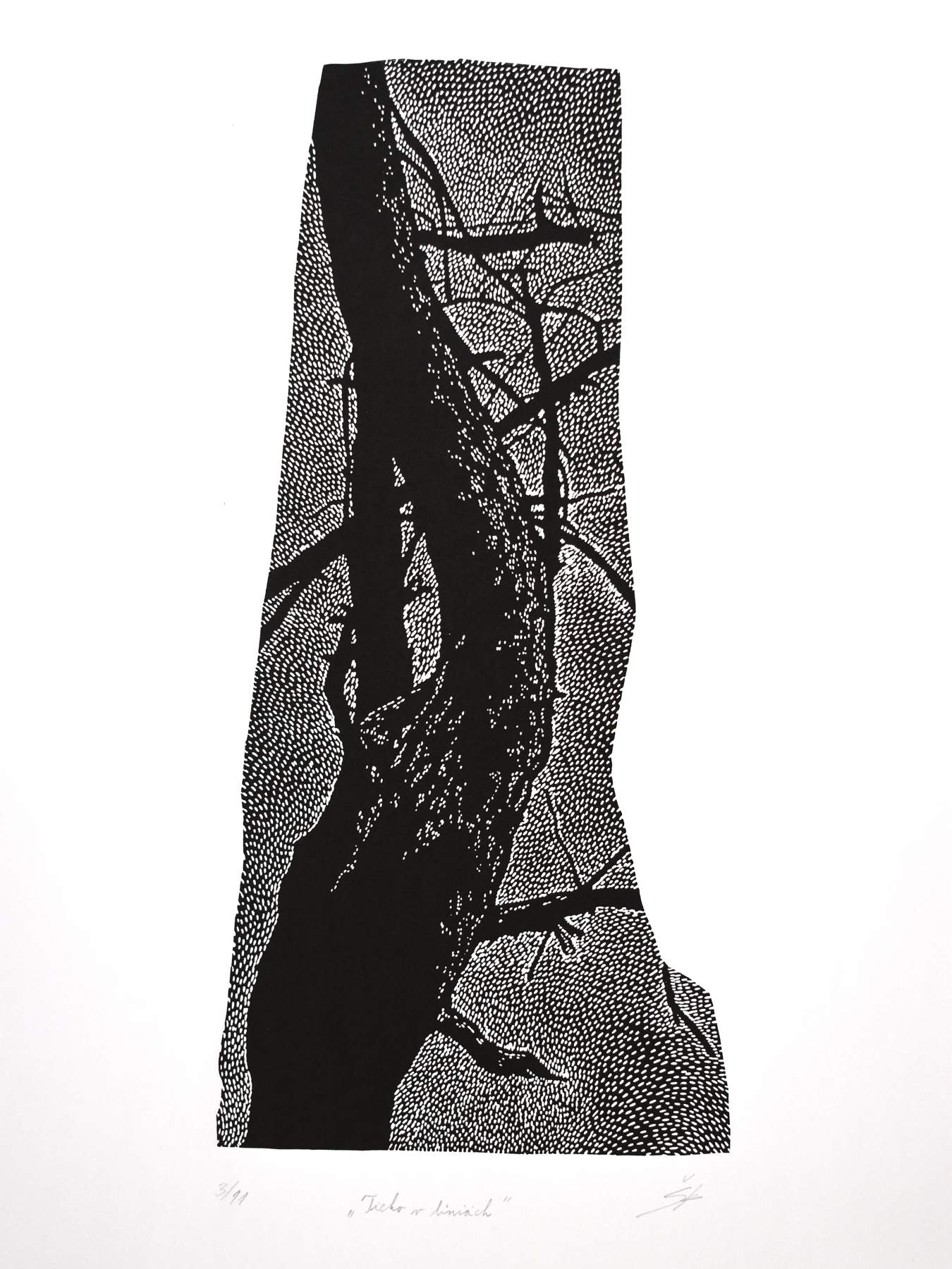 Katarína Šáleková – Ticho v líniach, linoryt, rozmer matrice 37,2 x 17,7 cm, rozmer papiera 50 x 35 cm, 2024