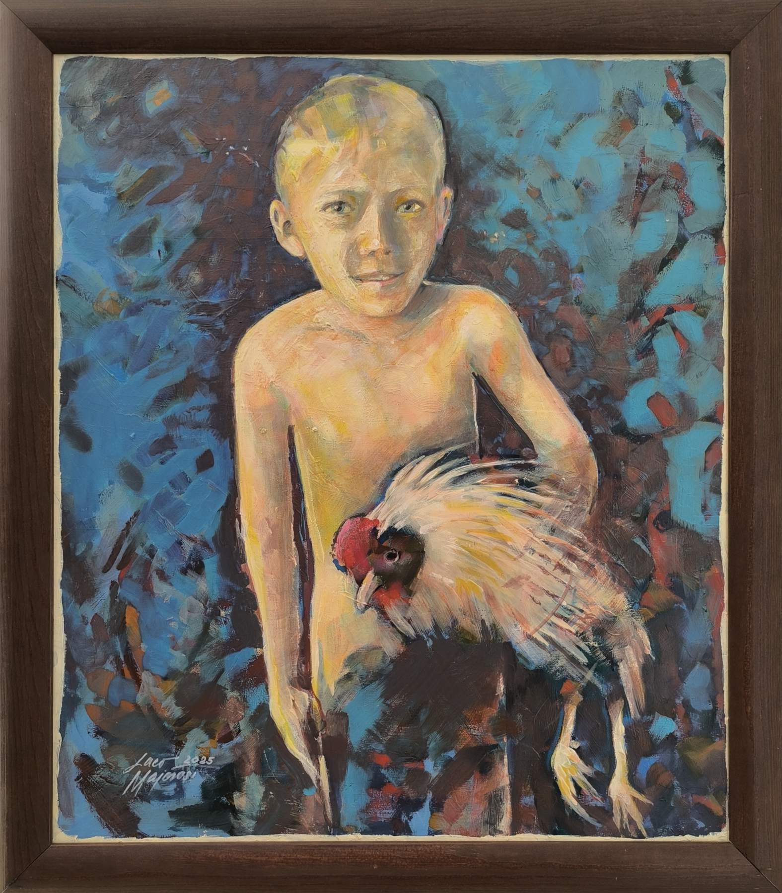Ladislav Majoroši – Chlapec s kohútom, akryl na sololite, 70 x 60 cm, 77,5 x 67,5 s rámom, 2025