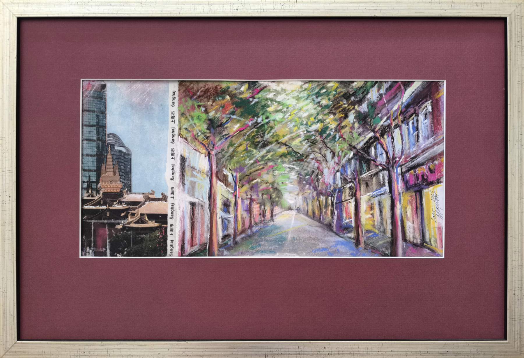 Ladislav Majoroši – Francúzka štvrť v Šanghaji, pastel, koláž na papieri, 19 x 39 cm, 38 x 56 cm s rámom, 2025