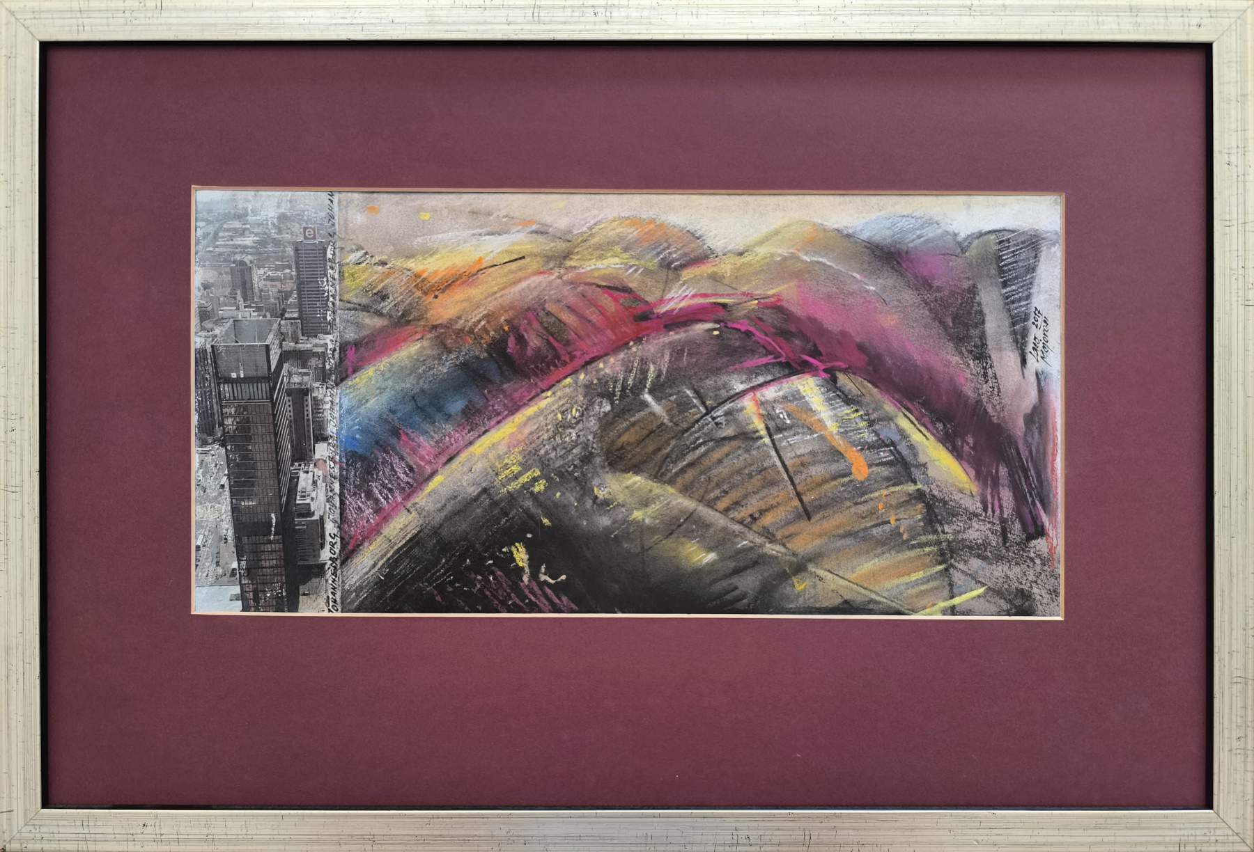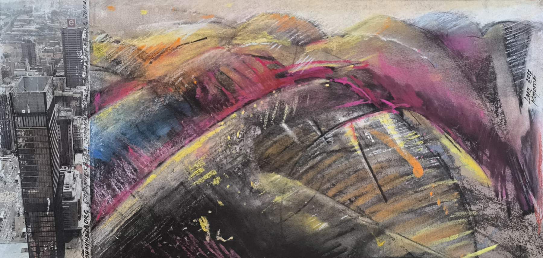 Ladislav Majoroši – Johannesburské haldy, pastel, koláž na papieri, 19 x 39 cm, 38 x 56 cm s rámom, 2017
