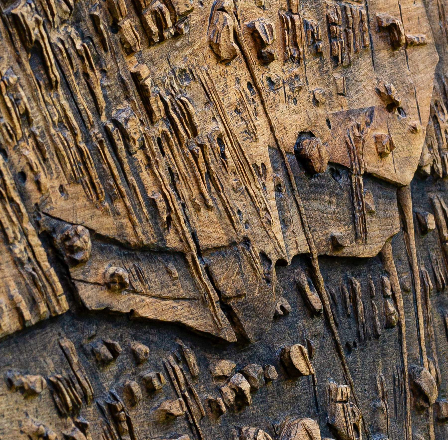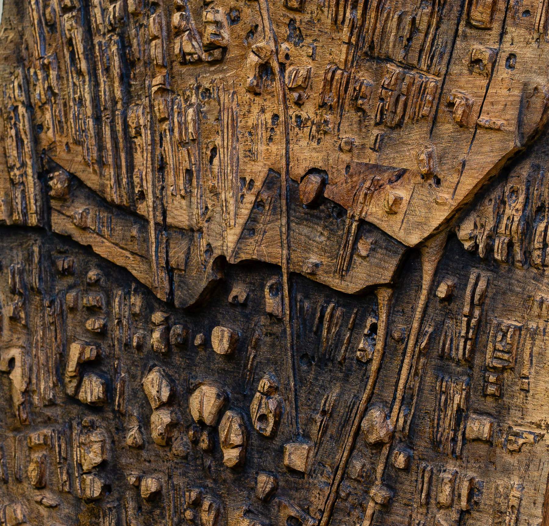 Ľubomír Kolinovský – Falling down, drevorezba, reliéf dub, 69 x 60 cm, 2025