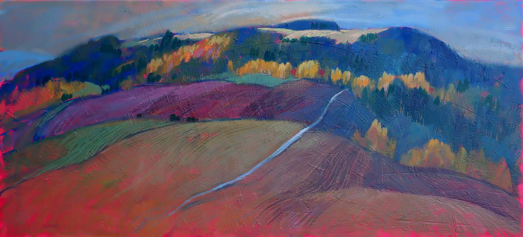 Miroslav Bucher – Portrét zeme – Jesenné premeny, olejomaľba na plátne, 55 x 120 cm