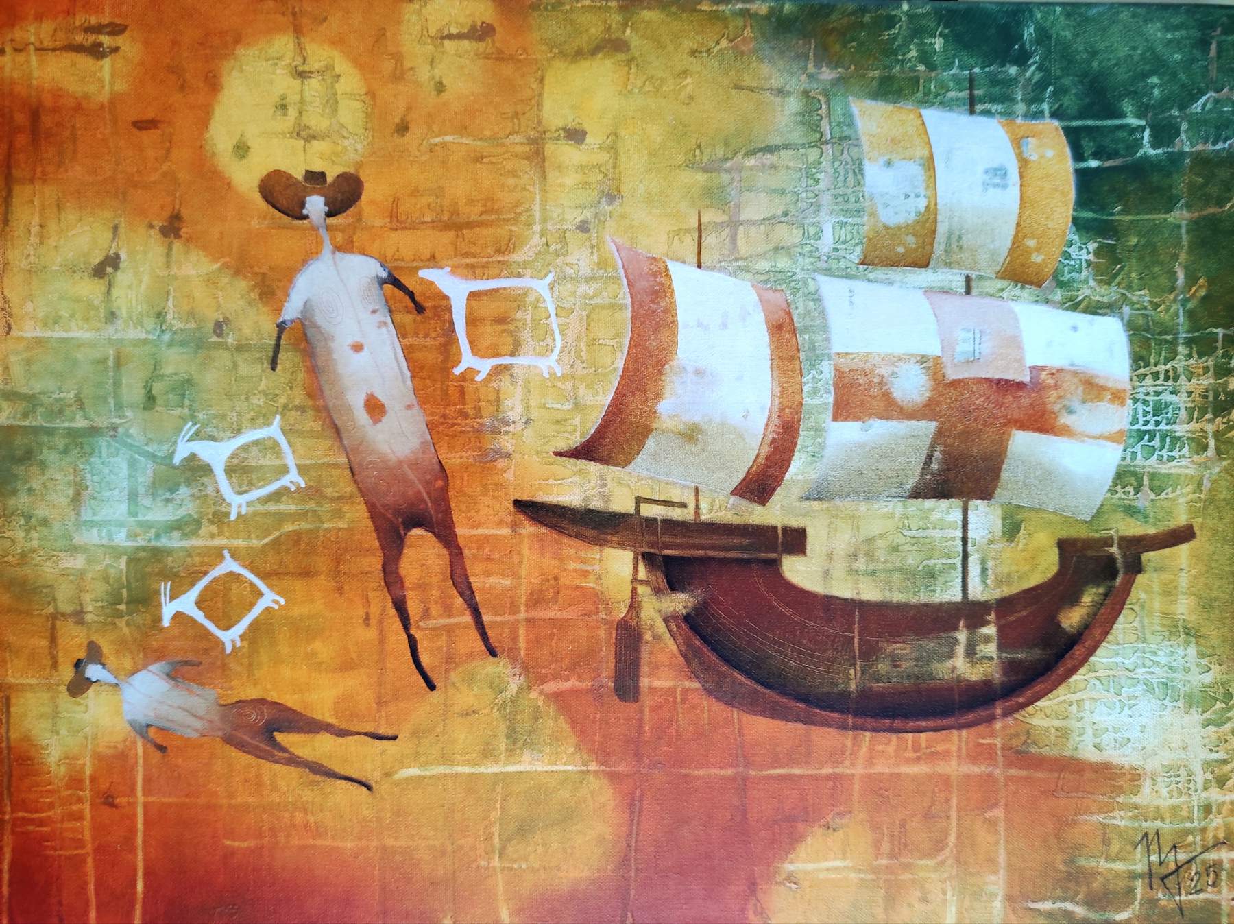 Norbert Judt – V prístave, kombinovaná technika na plátne, 50 x 70 cm, 2025