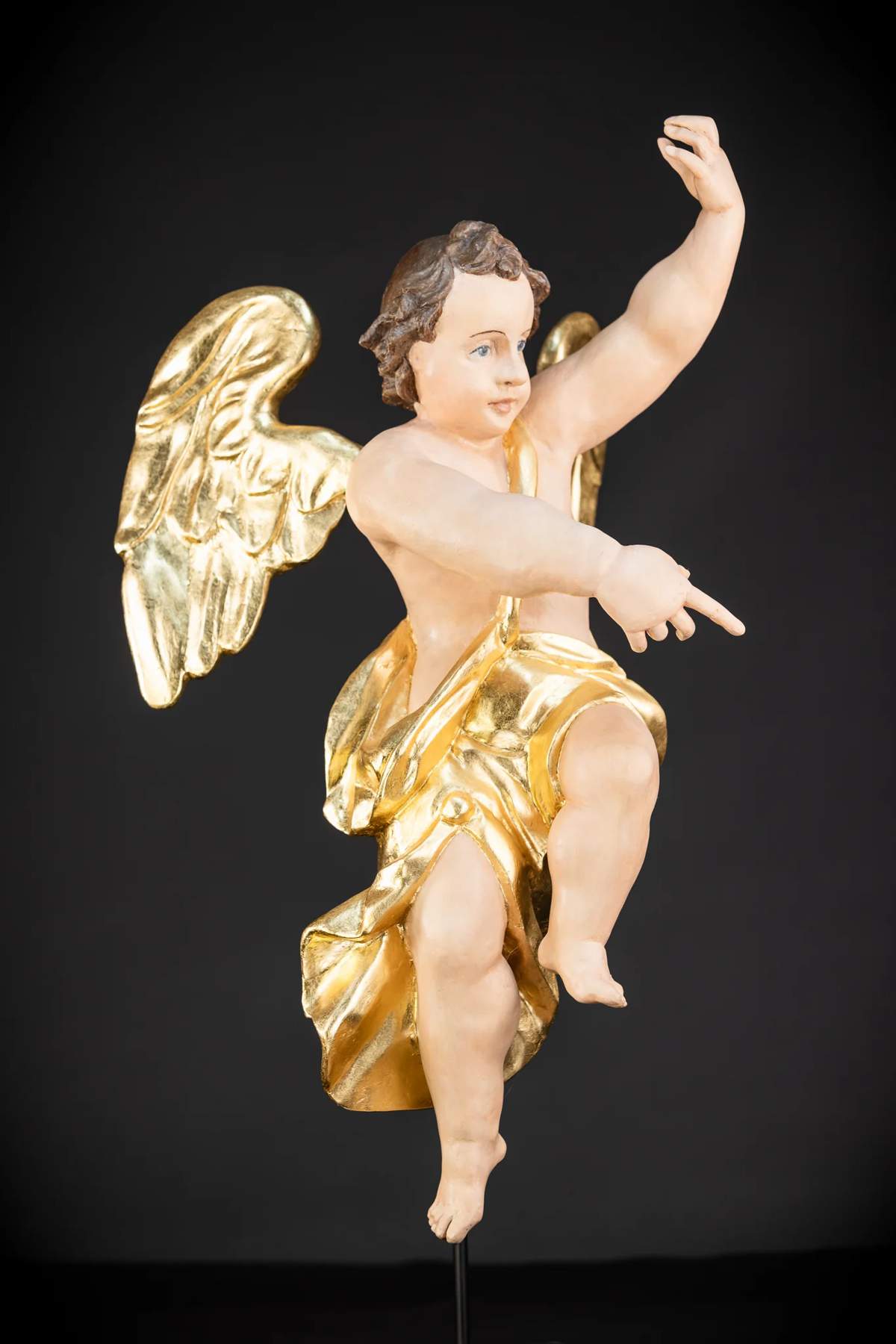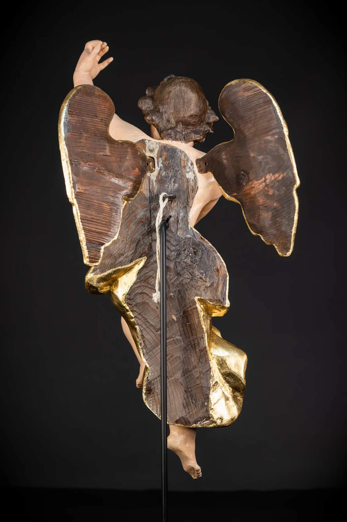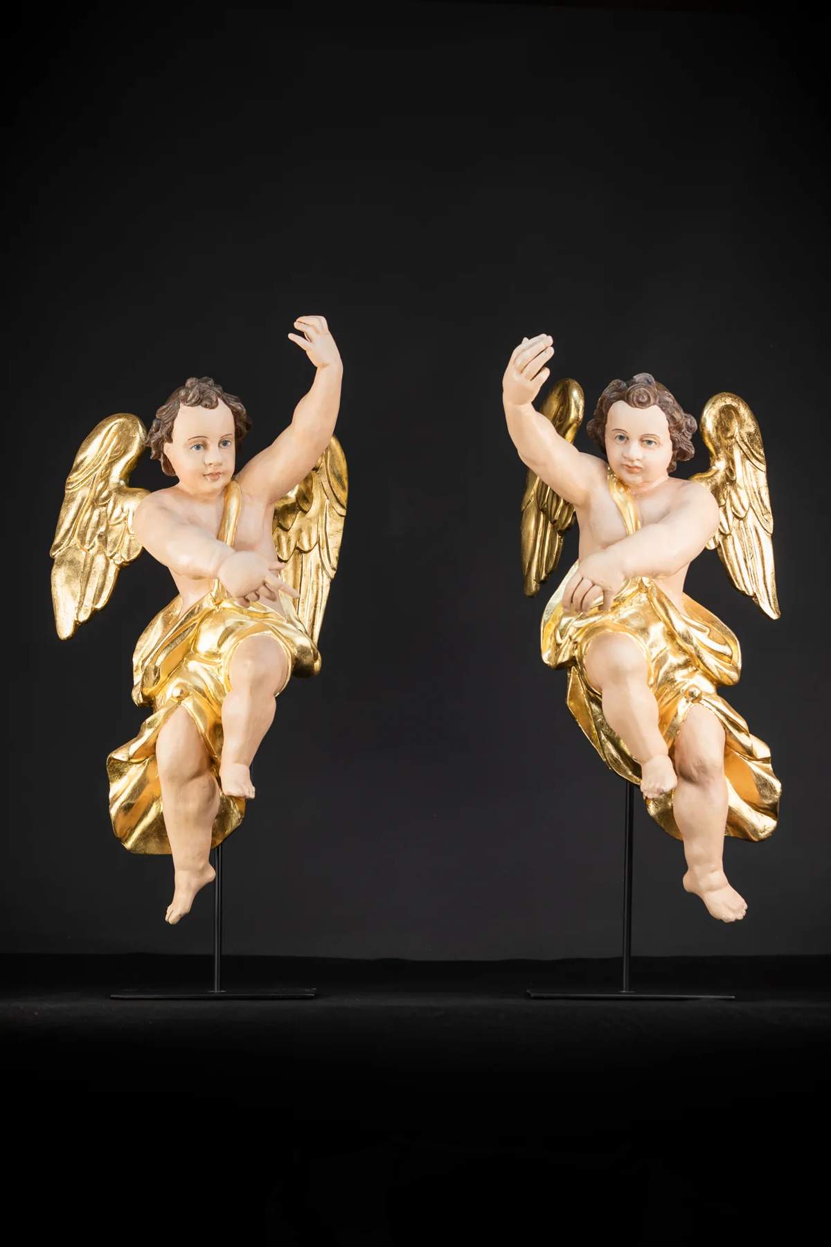 Vzácny, veľký a krásny pár starožitných drevených anjelov z 18. až 19. storočia. Profesionálne zreštaurované do bývalej krásy. Tieto anjelské rezbárske práce sa dodávajú s na mieru vyrobeným kovovým stojanom, z ktorého sa dajú ľahko vybrať a vystaviť zavesené.