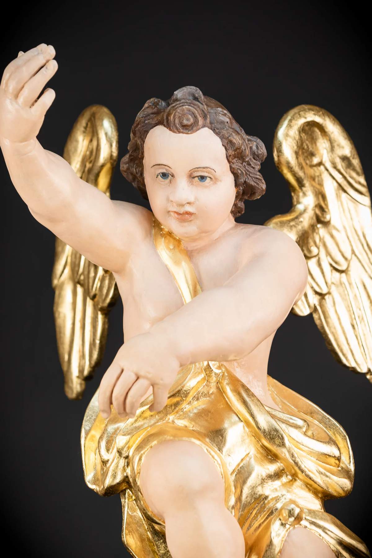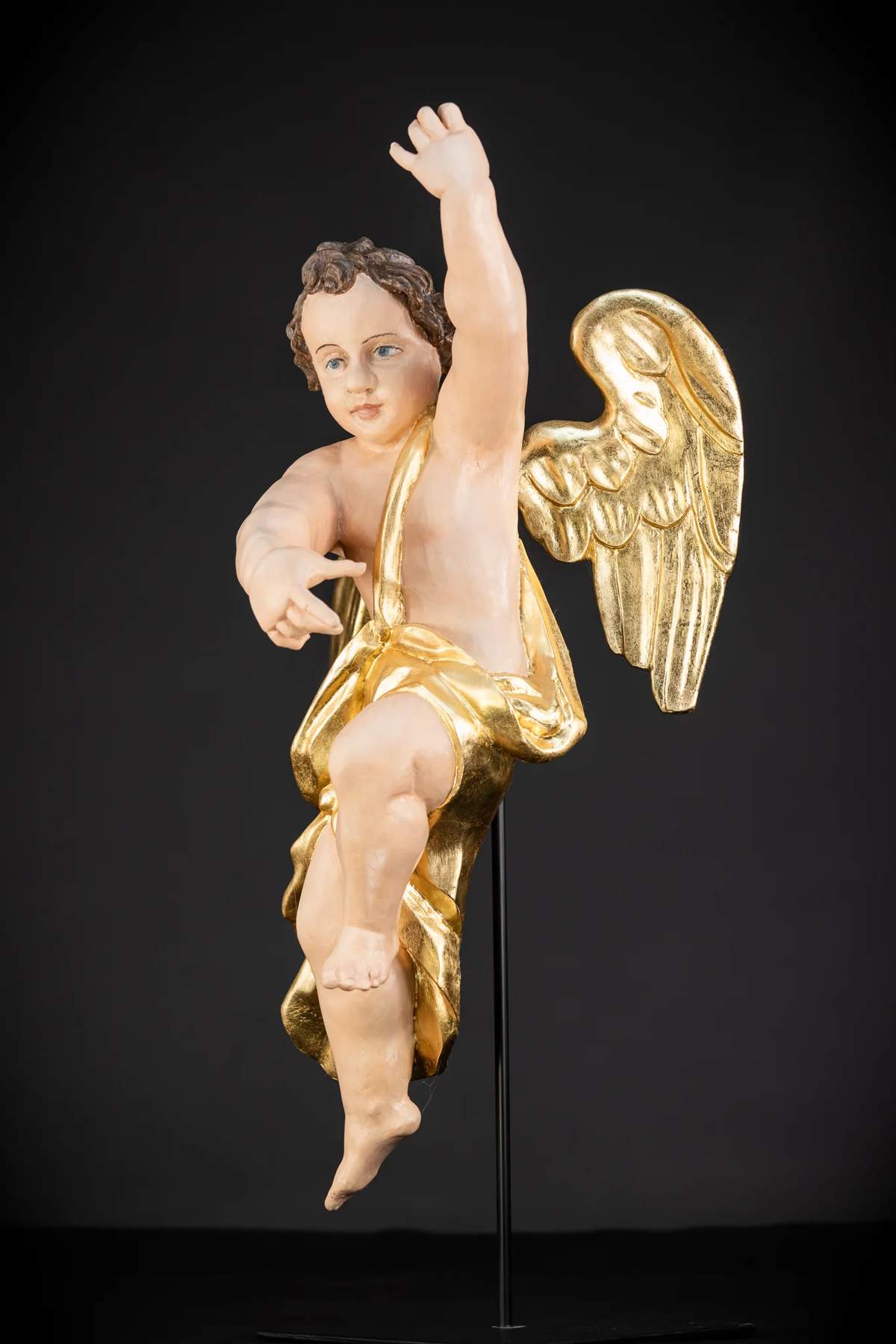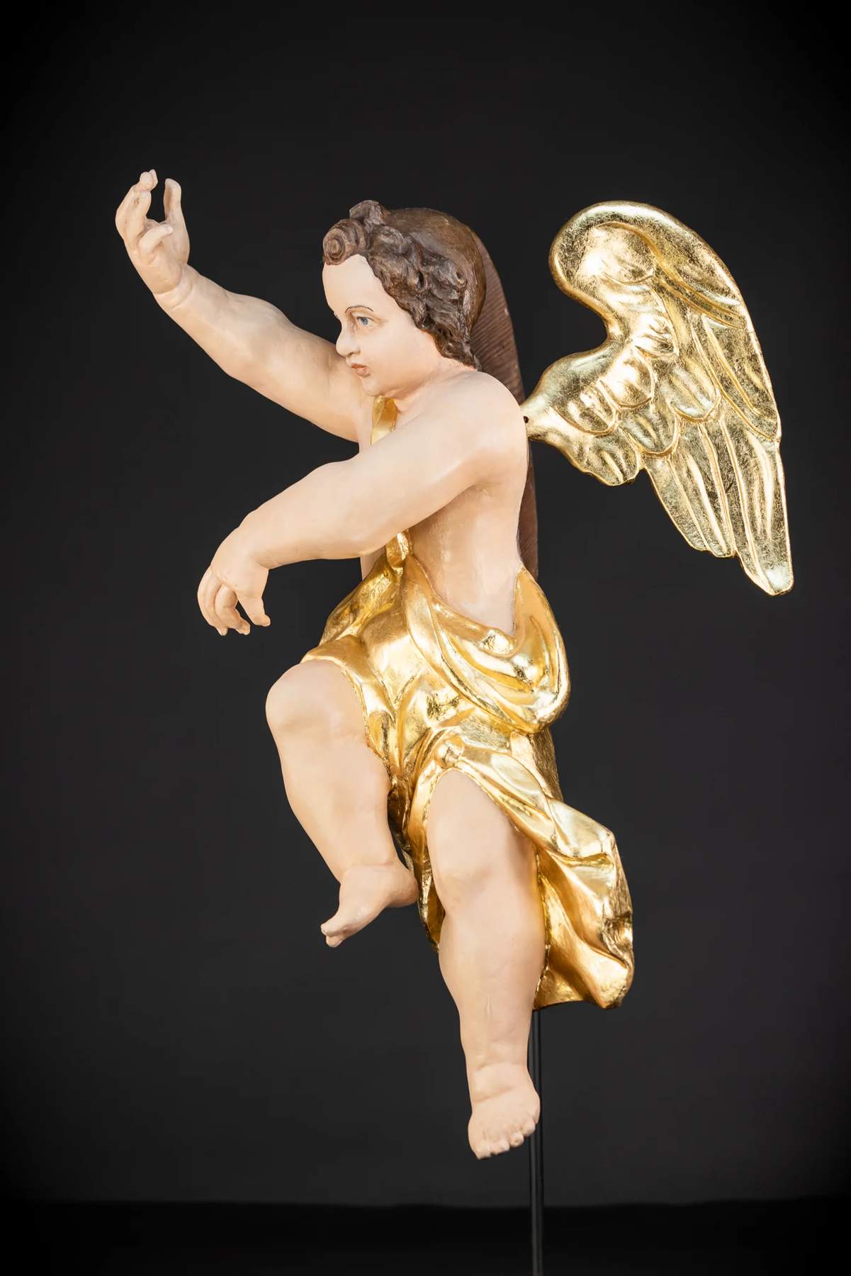 Vzácny, veľký a krásny pár starožitných drevených anjelov z 18. až 19. storočia. Profesionálne zreštaurované do bývalej krásy. Tieto anjelské rezbárske práce sa dodávajú s na mieru vyrobeným kovovým stojanom, z ktorého sa dajú ľahko vybrať a vystaviť zavesené.