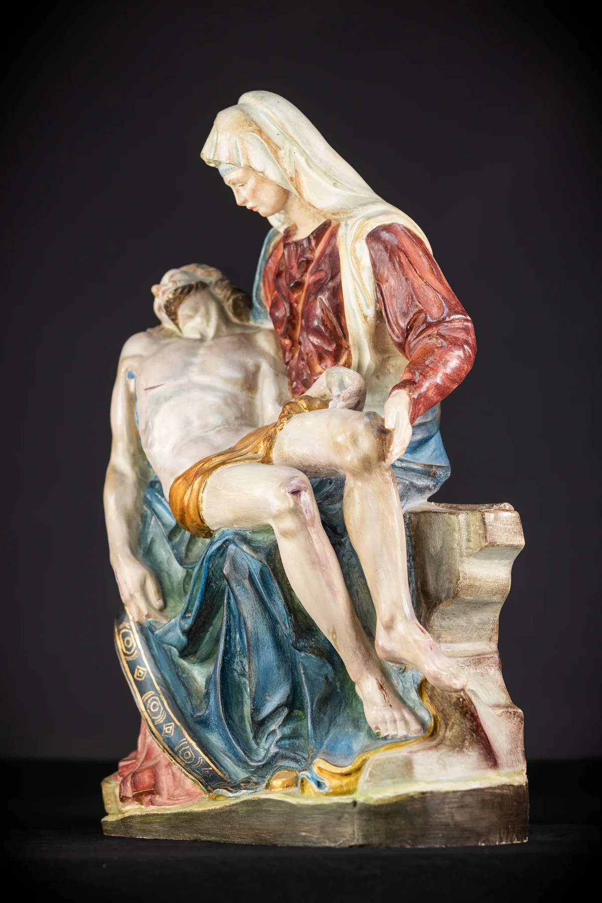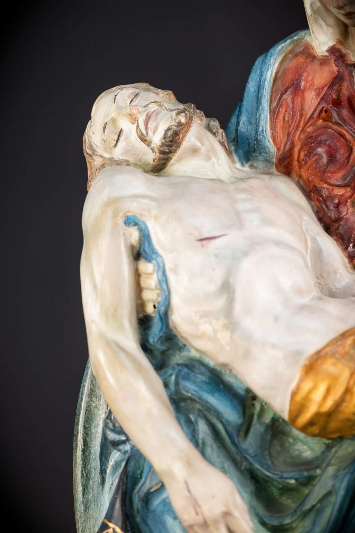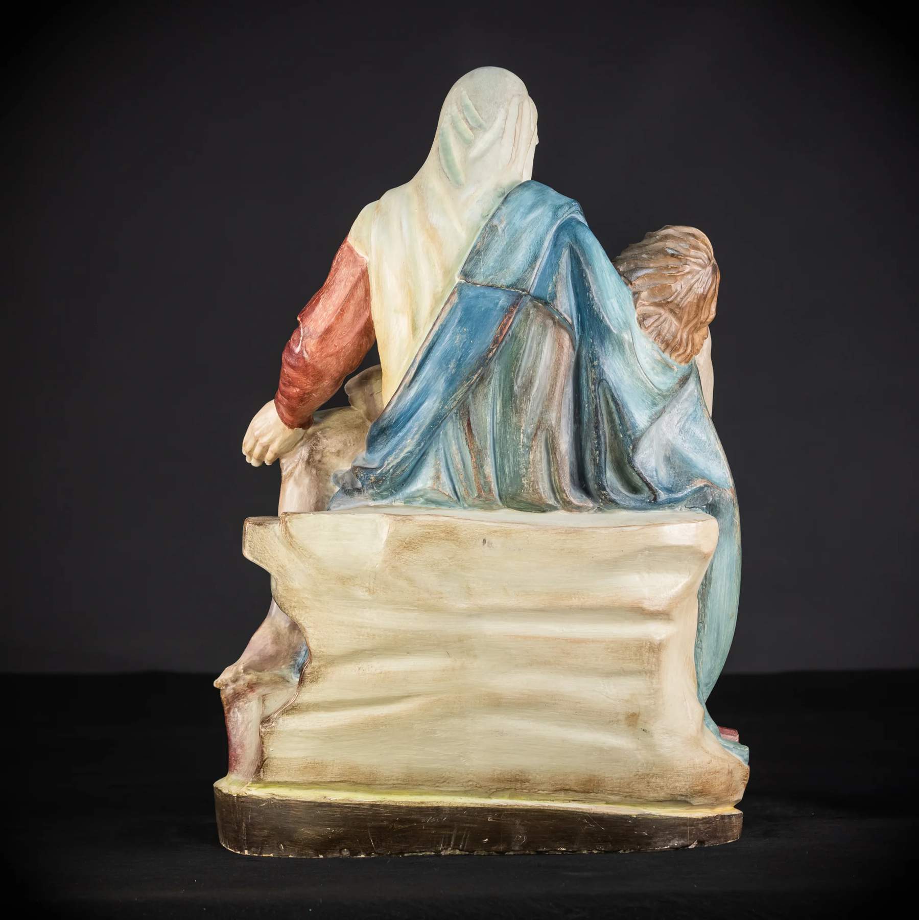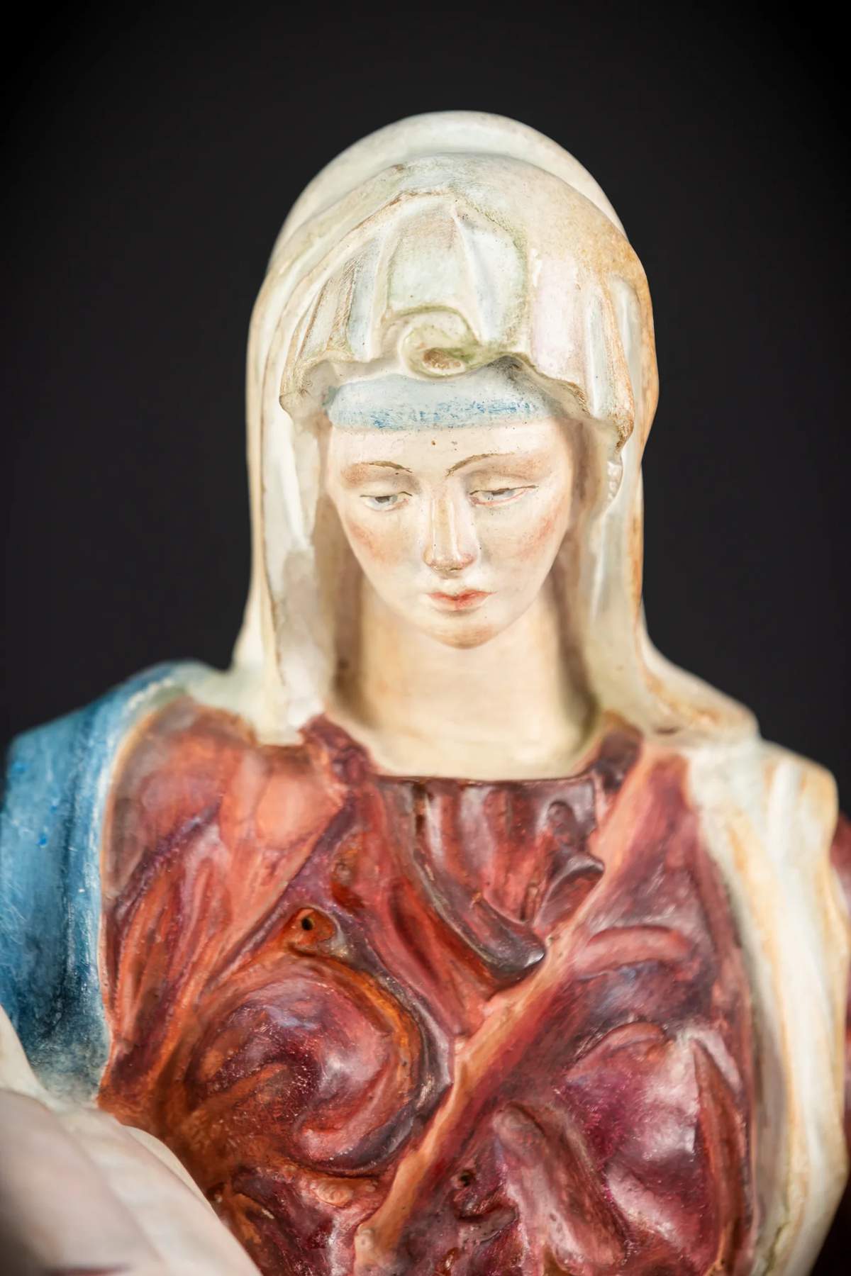 Nádherná vintage drevená socha z polovice 20. storočia zobrazujúca Pietu – Pannu Máriu, ktorá zviera mŕtve telo Ježiša. Skvelé drevorezbárske umenie s veľkým množstvom detailov na tomto slávnom umeleckom diele, ktoré zobrazuje telo Ježiša na lone jeho matky Márie po ukrižovaní. Pochádza z kláštora vo Francúzsku a pochádza z polovice 20. storočia.