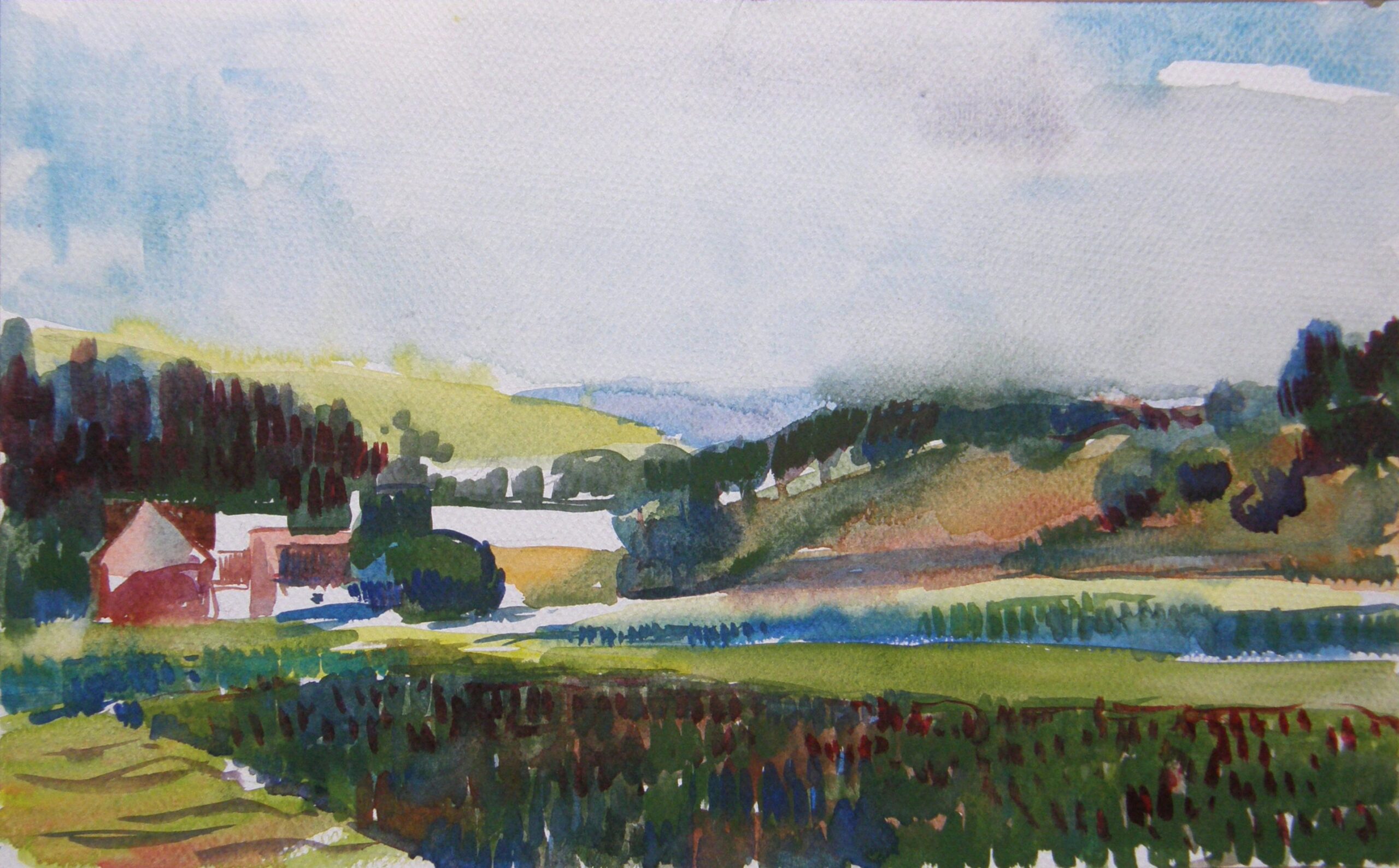 Jaroslav Staviščák – Pohľad na krajinu – Potoky Lúčky 2, akvarel, akvarelový papier, 17 x 28 cm, 2012